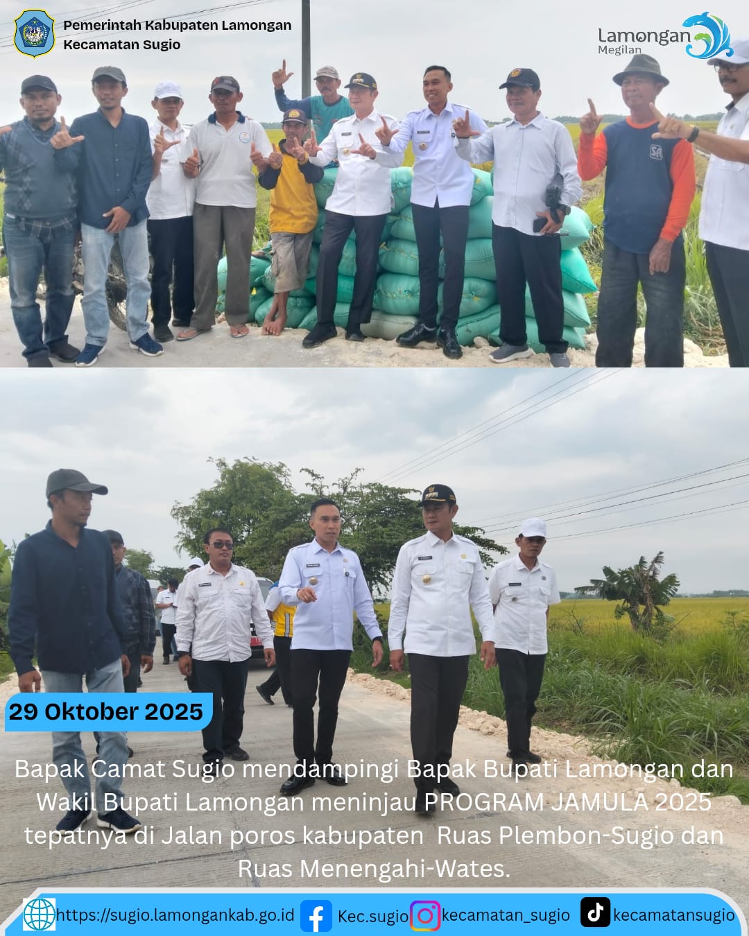 Sekarbagus - Pada hari Rabu, 29 Oktober 2025 kemarin, Camat Sugio bpk. Bambang purnomo, AP.,MM., berkesempatan mendampingi Bapak Bupati dan Wakil Bupati Lamongan sidak JAMULA pada pembangunan jalan ruas Plembon-Sugio dan Menengahi-Wates. Untuk pembangunan ruas Menengahi-Wates telah selesai 100%, sedangkan pada ruas Plembon-Sugio baru selesai 50%.
