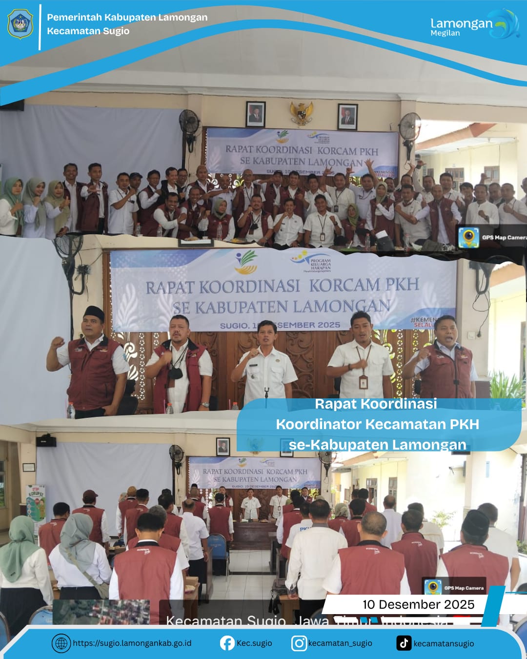 Sugio - Pagi ini Rabu tanggal 10 Desember 2025 Bapak Camat Sugio BAMBANG PURNOMO, A.P., M.M. berkesempatan menghadiri sekaligus membuka giat Rapat Koordinasi Korcam PKH Se- Kabupaten Lamongan. Giat yang juga dihadiri oleh Kordinator Kabupaten yakni Bapak Achmad Bayu Kurniawan dan Bapak Dwi Hari Mulyono tersebut diikuti oleh Ketua Korcam se-Kabupaten Lamongan. Berlangsung di Pendopo Kecamatan Sugio, menjadi momen penting utamanya bagi peningkatan kualitas SDM PKH.
