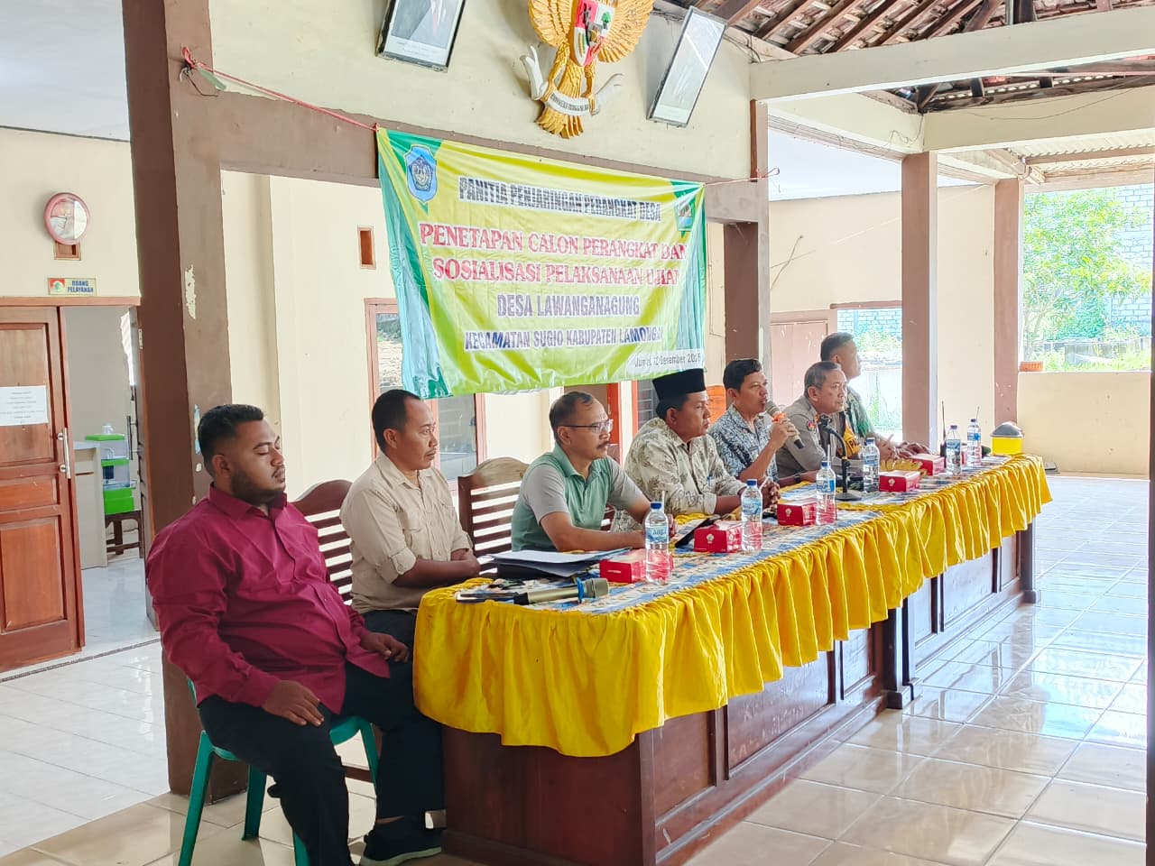 Lawanganagung - Pagi tadi (12/12) bertempat di Balai Desa Lawanganagung dilaksanakan agenda selanjutnya dari proses penjaringan Perangkat Desa Lawanganagung yakni Penetapan Calon Perangkat dan Sosialisasi Pelaksanaan Ujian Desa Lawanganagung Kecamatan Sugio Kabupaten Lamongan.