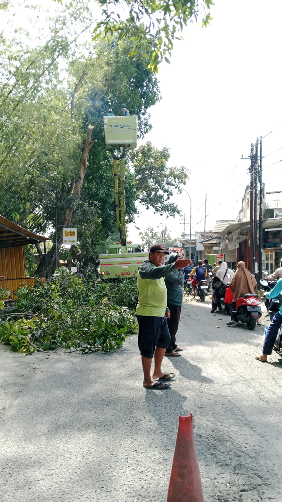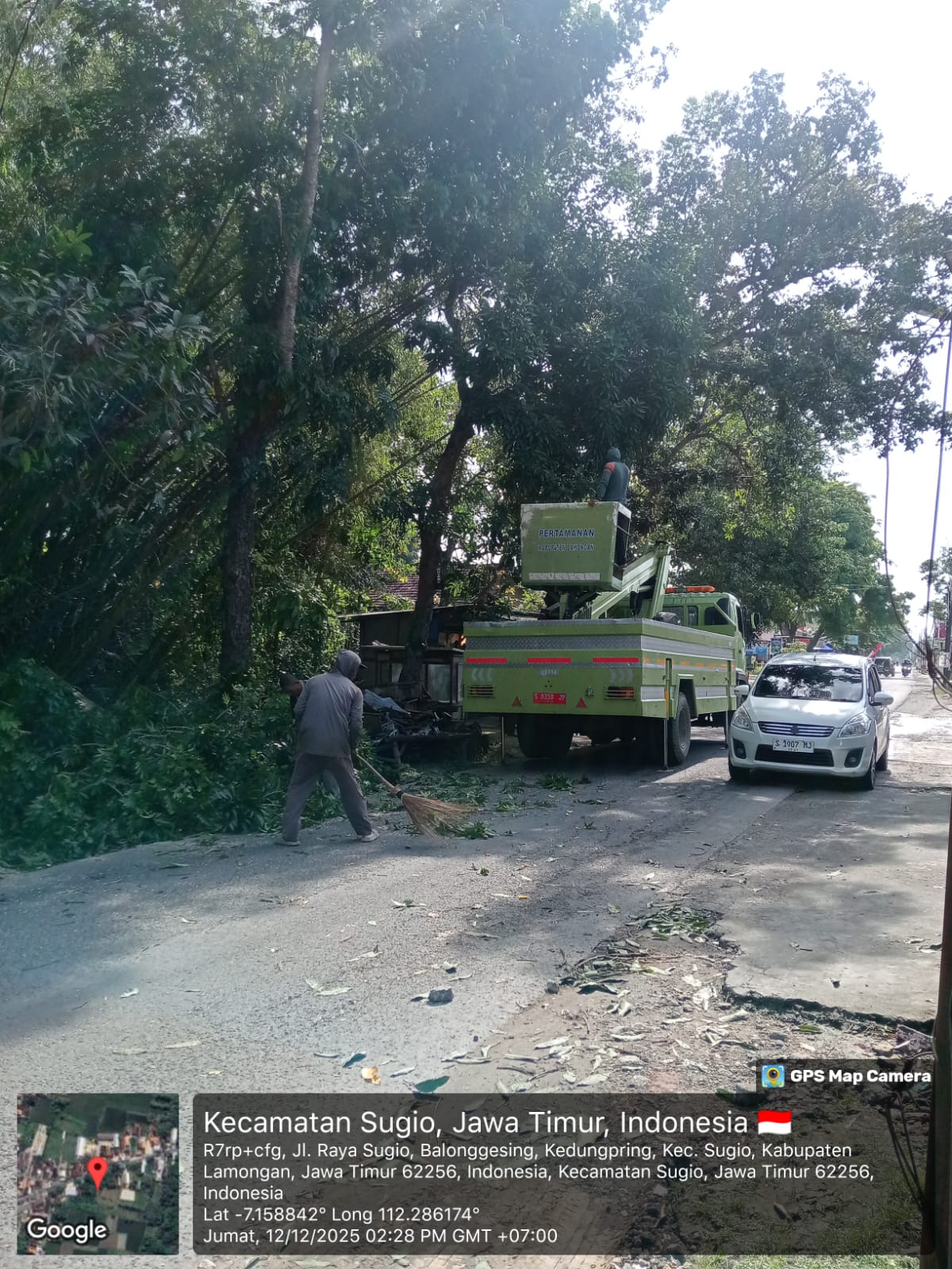 Lebakadi - Mohon maaf apabila perjalanan terganggu utamanya bagi pengguna jalan ruas Sugio - Tlanak tepatnya di Dusun Balonggesing Desa Lebakadi Kecamatan Sugio. Terdapat pemangkasan pohon rawan tumbang oleh Petugas dari Dinas PU Bina Marga Kabupaten Lamongan yang bekerjasama dengan Tim Tanggap Bencana Kecamatan Sugio siang ini (12/12).