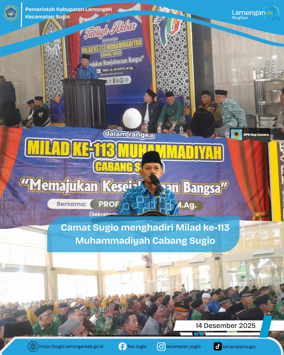 Sugio - Minggu 14 Desember 2025 kemarin Camat Sugio bpk. Bambang Purnomo, AP., MM. turut hadir pada puncak acara peringatan Milad ke-113 Muhammadiyah Cabang Sugio. Kegiatan yang berlangsung di Masjid Sabilillah Desa Sugio Kecamatan Sugio Kabupaten Lamongan.