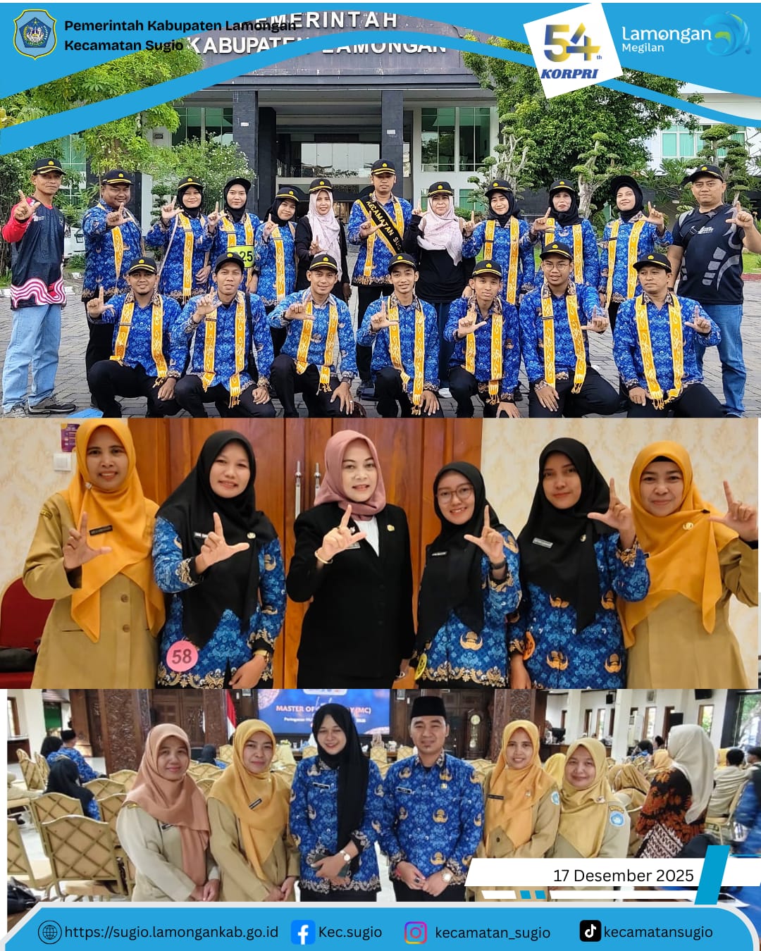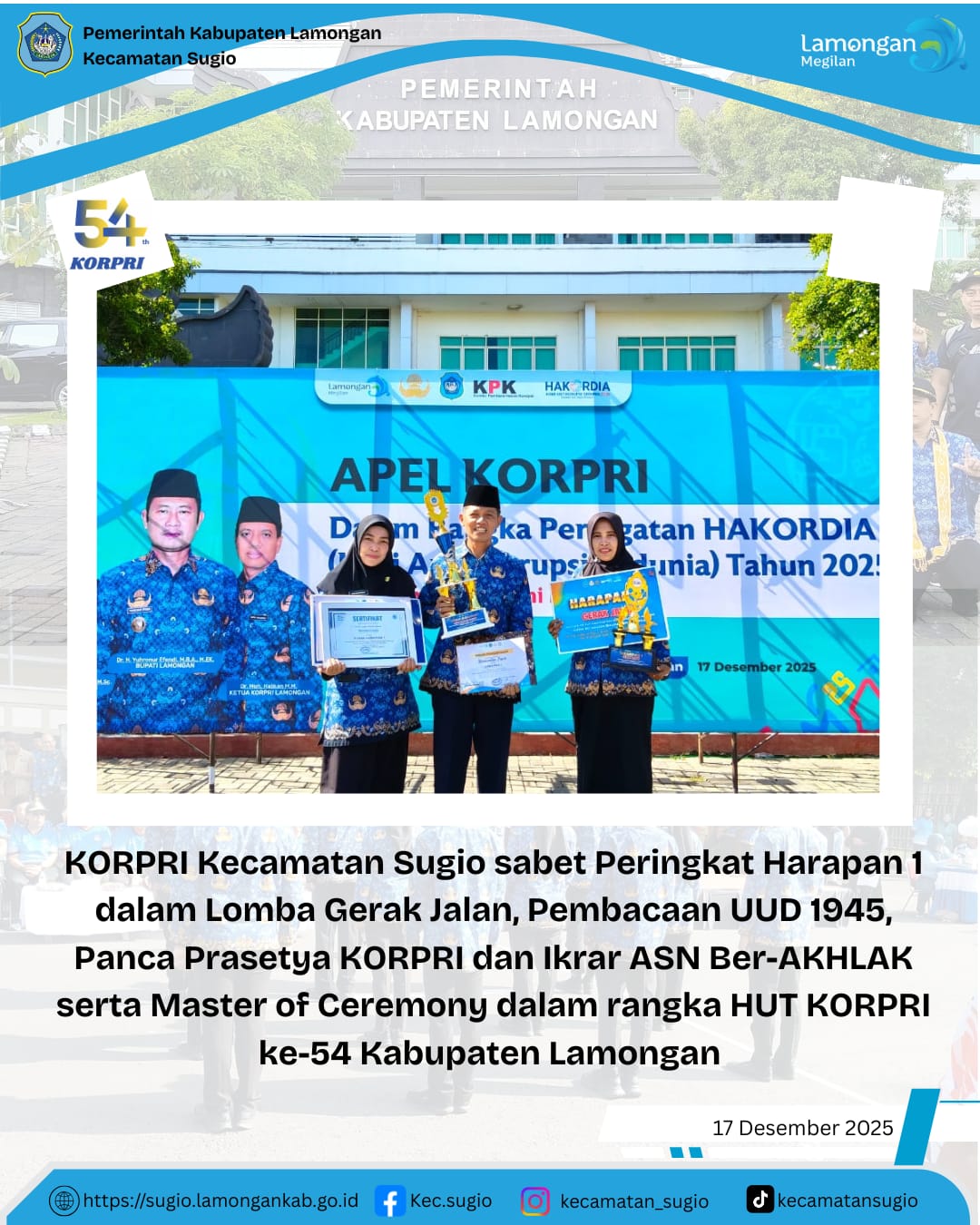 Selamat dan sukses atas diraihnya Juara Harapan 1 pada perlombaan Gerak Jalan, lomba pembacaan pembukaan UUD 1945, Panca Prasetya KORPRI dan Ikrar ASN Ber-AKHLAK sert lomba Master of Ceremony yang diselenggaran dalam rangka HUT KORPRI ke-54 Kabupaten Lamongan.