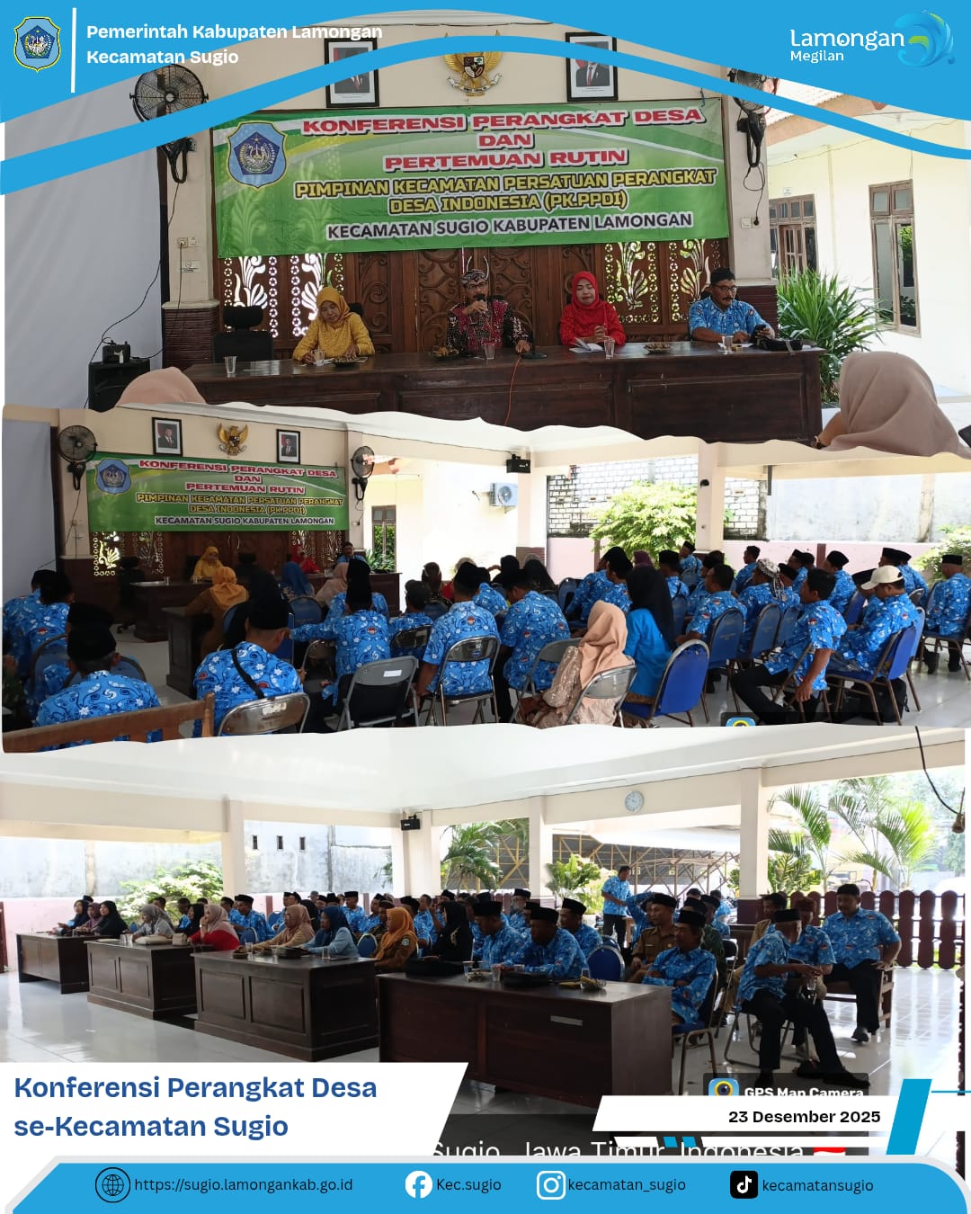 Sugio - Konferensi Perangkat Desa se-Kecamatan Sugio untuk agenda Bulan Desember 2025 dilaksanakan pada hari Selasa tanggal 23 Desember 2025 kemarin di Pendopo Kecamatan Sugio. Konferensi yang dibuka oleh Sekretaris Kecamatan Sugio bpk. Susilo Wahyuono, SE.MM. tersebut diisi materi oleh Kasi Pemerintahan dan Kasi Pelayanan Publik serta Ketua PK-PPDI Kecamatan Sugio.