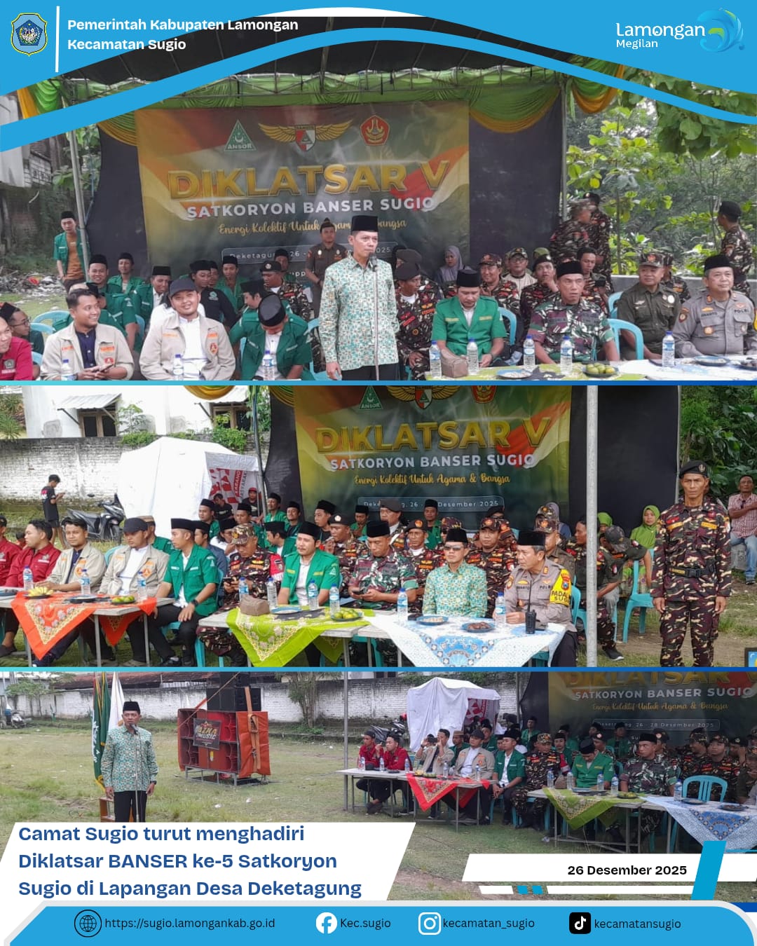 Deketagung - Camat Sugio bpk. Bambang Purnomo, AP., M.M. bersama jajaran Forkopimcam Sugio menghadiri Diklatsar V BANSER Satkoryon Sugio pada hari Jumat tanggal 26 Desember 2025 kemarin. Kegiatan tersebut berlangsung di Lapangan Desa Deketagung.