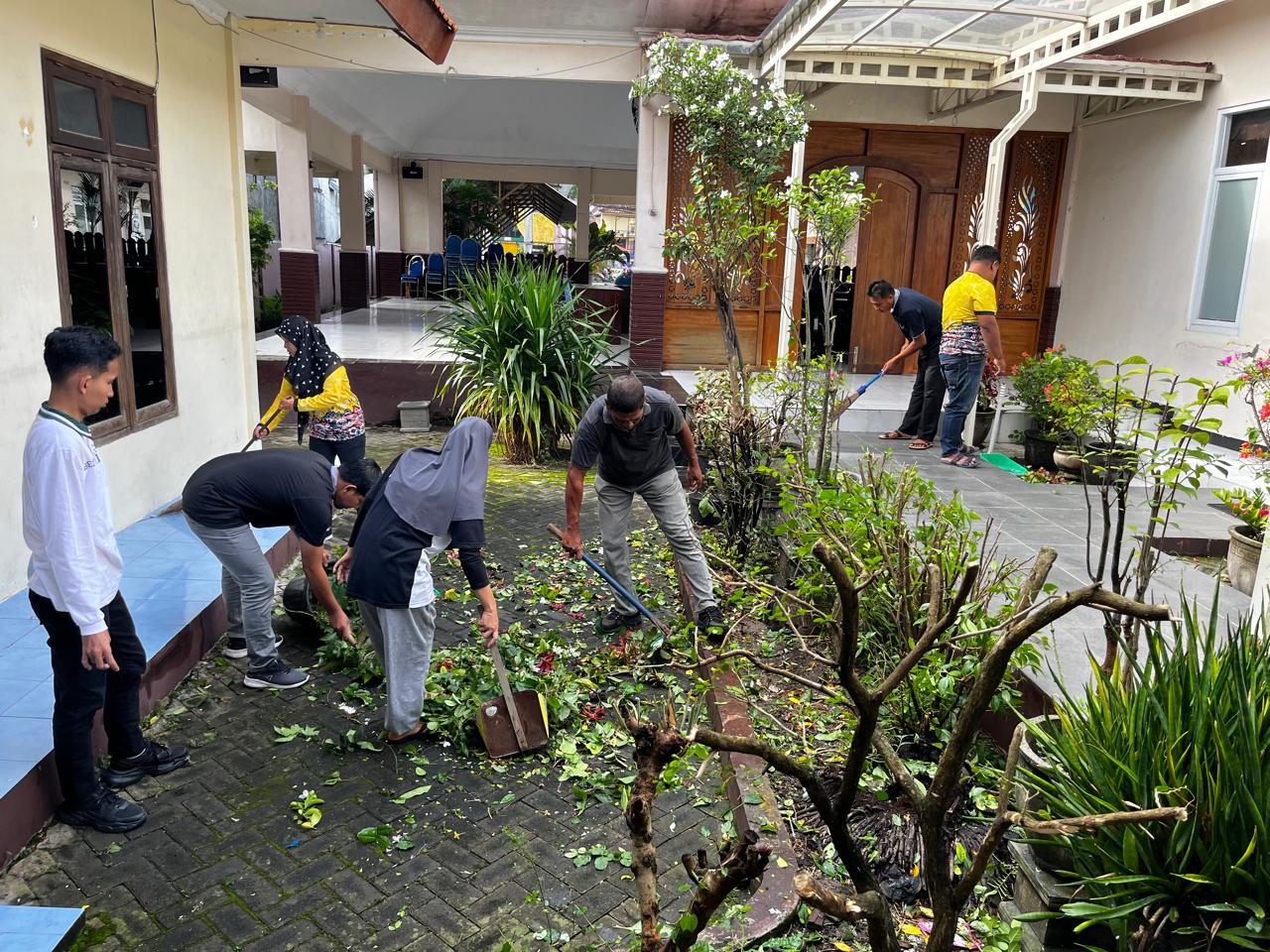 Seluruh staf Kecamatan Sugio bahu membahu bergotong royong membersihkan lingkungan mulai dari depan hingga belakang kantor.