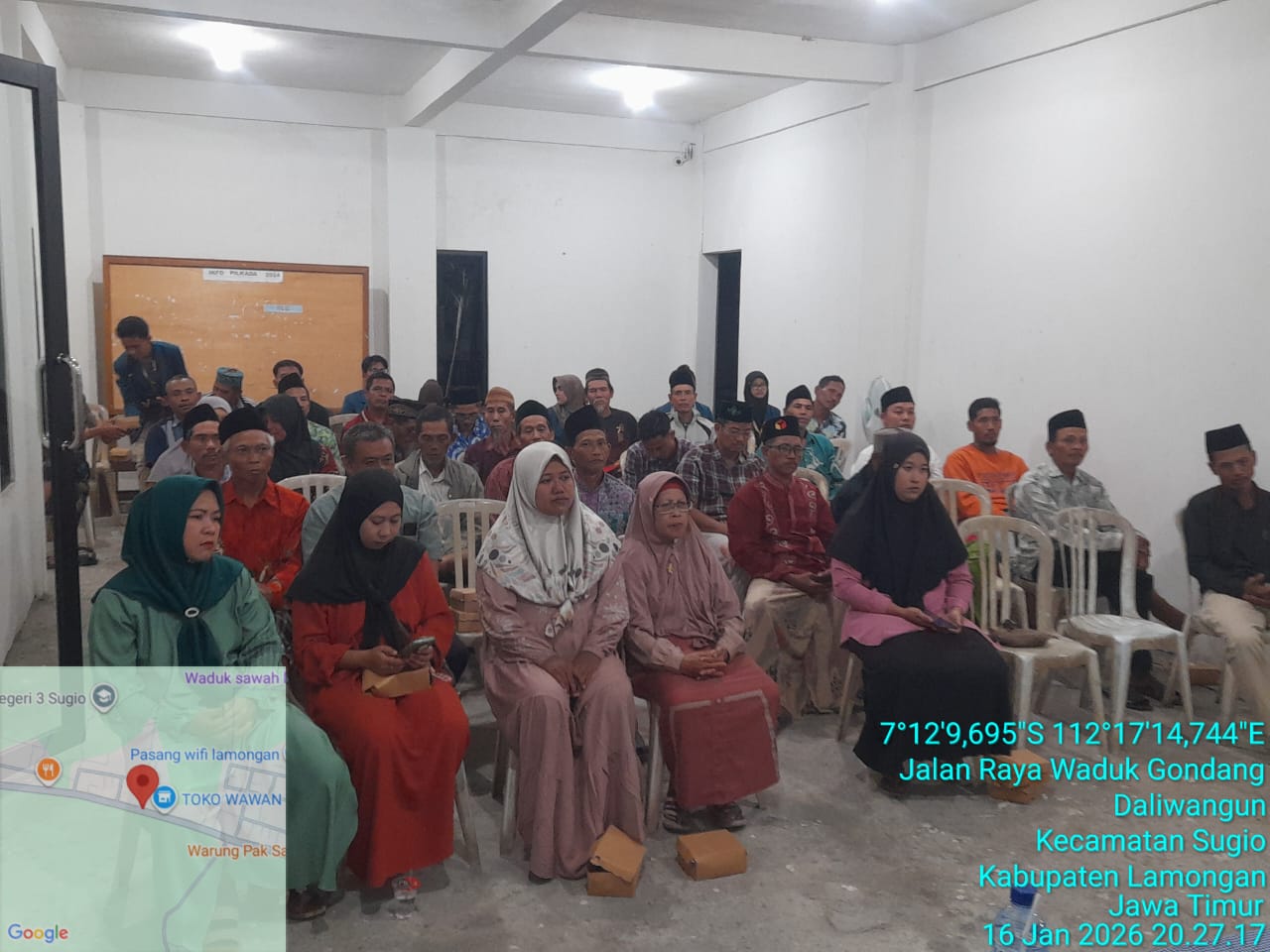 Daliwangun - Camat Sugio menghadiri Musyawarah Desa Daliwangun Kecamatan Sugio. Musyawarah desa dengan agenda Laporan Pertanggungjawaban Anggaran Pendapatan dan Belanja Desa Tahun Anggaran 2025 tersebut serta beberapa agenda lainnya seperti Penetapan KPM BLT-Dana Desa Tahun Anggaran 2026 dan Penetapan Aset Desa untuk lahan KDMP Desa Daliwangun Kecamatan Sugio Kabupaten Lamongan tersebut juga dihadiri oleh Pendamping Desa, Babinsa dan Bhabinkamtibmas serta diikuti oleh seluruh unsur LKD dan tokoh masyarakat desa setempat. Kegiatan yang berlangsung pada hari Jumat tanggal 16 Januari 2026 malam di Balai Desa Daliwangun.