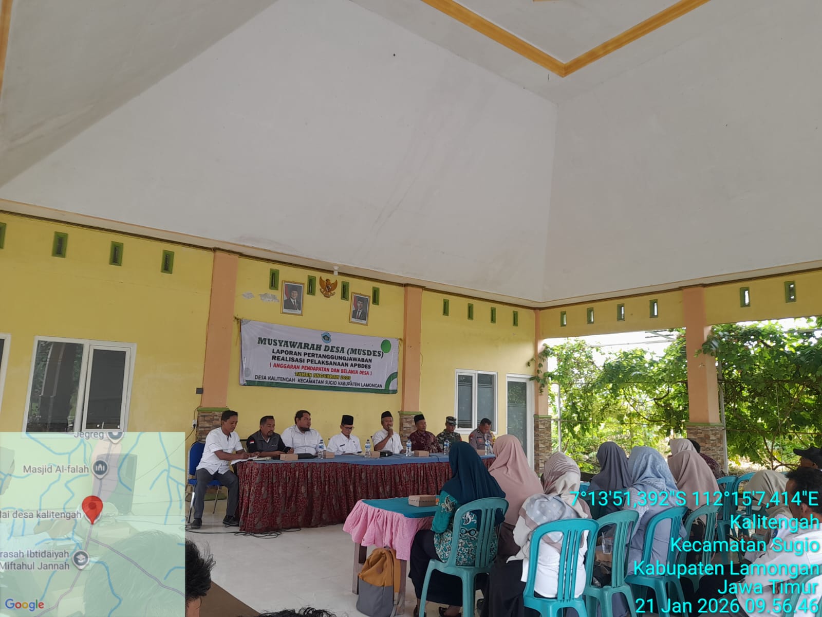 Musyawarah desa dengan agenda Laporan Pertanggungjawaban Realisasi Anggaran Pendapatan dan Belanja Desa Tahun Anggaran 2025 serta beberapa agenda lainnya seperti Penetapan KPM BLT-Dana Desa Tahun Anggaran 2026 dan Penetapan Aset Desa untuk lahan KDMP Desa Kalitengah Kecamatan Sugio Kabupaten Lamongan tersebut juga dihadiri oleh Pendamping Desa, Babinsa dan Bhabinkamtibmas serta diikuti oleh seluruh unsur LKD dan tokoh masyarakat desa setempat. Kegiatan tersebut berlangsung pada pagi hari tadi (21/01) di Balai Desa Kalitengah.