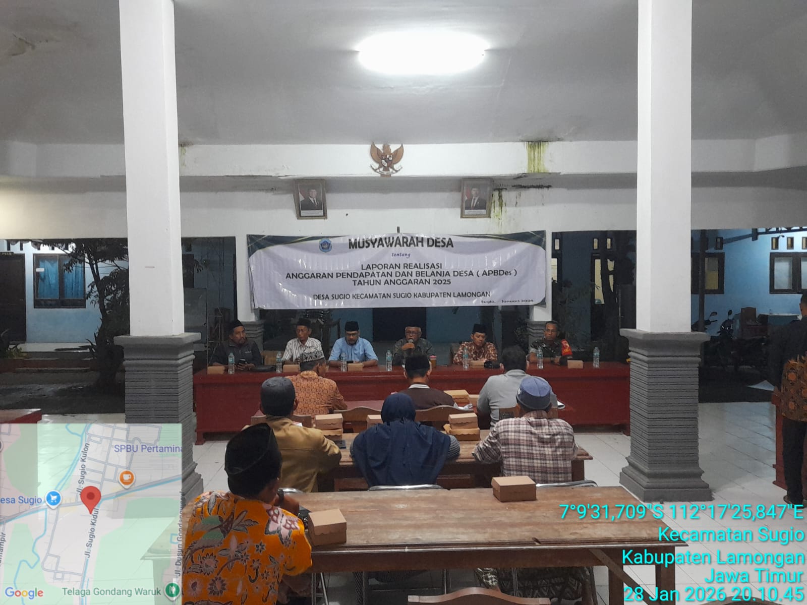 Musyawarah desa dengan agenda Laporan Pertanggungjawaban Realisasi Anggaran Pendapatan dan Belanja Desa Tahun Anggaran 2025 serta beberapa agenda lainnya seperti Penetapan KPM BLT-Dana Desa Tahun Anggaran 2026 dan Penetapan Aset Desa untuk lahan KDMP Desa Sugio Kecamatan Sugio Kabupaten Lamongan tersebut juga dihadiri oleh Pendamping Desa, Babinsa dan Bhabinkamtibmas serta diikuti oleh seluruh unsur LKD seperti BPD, LPM, Karang Taruna, PKK, Posyandu dan tokoh masyarakat desa setempat. Kegiatan tersebut berlangsung pada hari Rabu tanggal 28 Januari 2026 di Balai Desa Sugio.