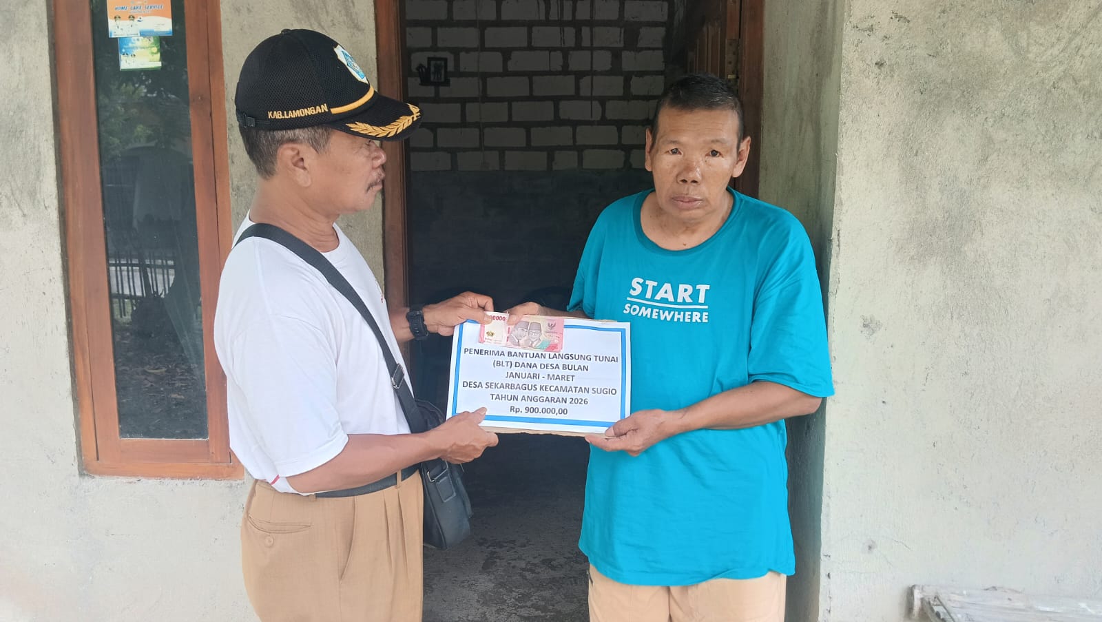 Pada hari Selasa, 31 Maret 2026 pagi tadi Pemerintah Desa Sekarbagus Kecamatan Sugio Kabupaten Lamongan melaksanakan penyaluran Bantuan Langsung Tunai Dana Desa (BLT-DD) untuk Tribulan I (Januari - Maret) Tahun Anggaran 2026. Mengingat Keluarga Penerima Manfaat (KPM) memiliki keterbatasan mobilitas, maka penyerahan langsung di rumah KPM oleh petugas bersama Pendamping Lokal Desa (PLD).